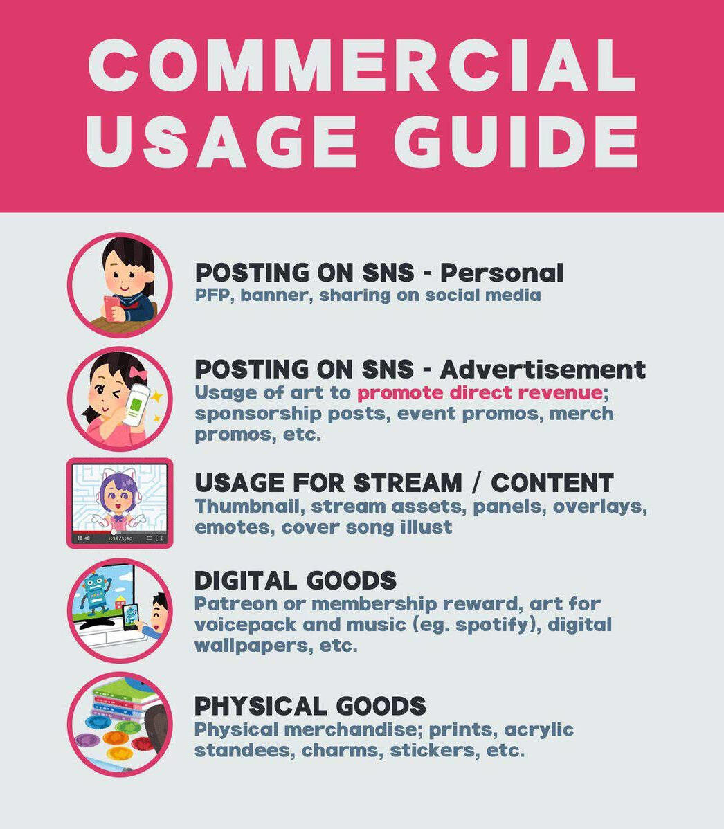 See below for commercial usage guide for custom illustration. This does not apply to assist services and emotes.